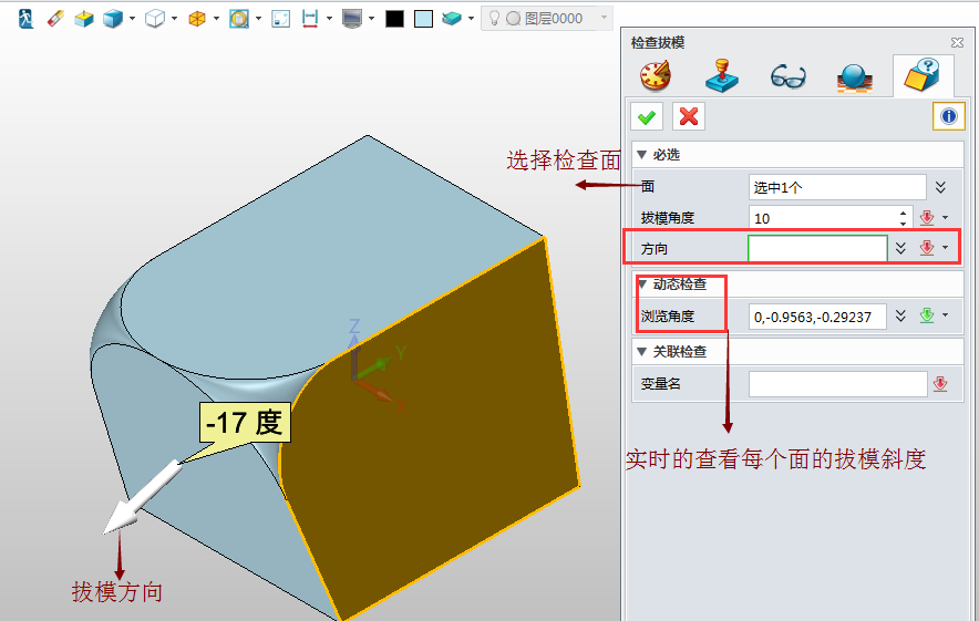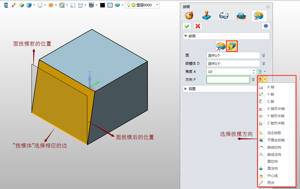 為了避免出現這種做無用功的情況,中望3D考慮得非常全面。在中望3D的軟件環境下,在設置拔模方向時,可以直接在“方向”的下拉菜單中,根據實際需要進行方向選擇,避免出現前面提到的無效設計的情況。