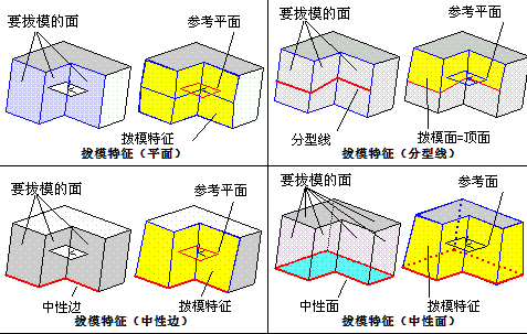 如圖3中所示,黃色面為拔模面,對應不同的參考平面及中性面,會產生不同的拔模效果。