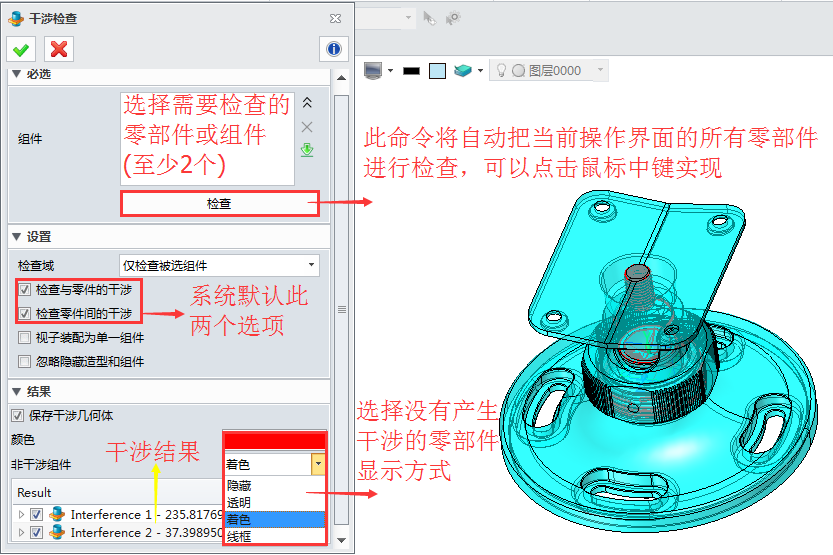 模式2:檢查產(chǎn)品的所有零部件的干涉情況,可以點(diǎn)擊圖1中的“檢查”命令,也可以單擊鼠標(biāo)中鍵進(jìn)行選擇。