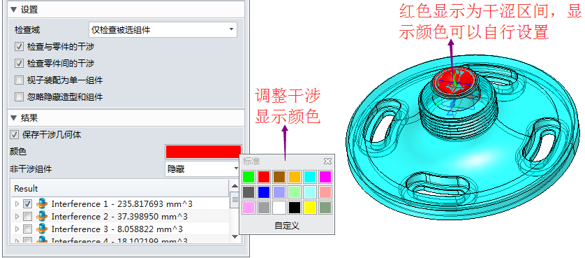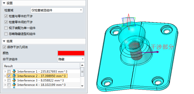 查看檢查結(jié)果,可在“Result”列表中選擇,如圖2-圖4所示,中望3D會(huì)根據(jù)不同的干涉結(jié)果,只顯示出與此相關(guān)的兩個(gè)零件,而且干涉區(qū)間會(huì)以不同顏色的實(shí)體顯示,相比其他三維設(shè)計(jì)軟件的干涉檢查結(jié)果顯示,中望3D操作的結(jié)果更加直觀,更有利于設(shè)計(jì)師快速查找出干涉的問題。