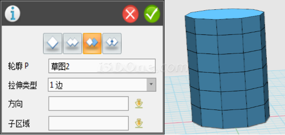 2、選擇特殊造型,點(diǎn)擊拉伸,選中剛才繪制的造型,輸入拉伸高度70,中鍵確定,可得: