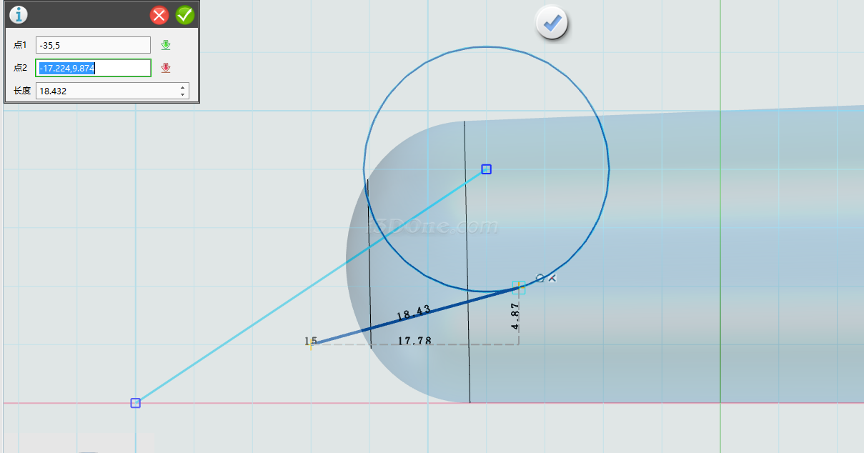 繪制直線。如圖(點1位置設為-35,5,點2自動捕捉圓的相切點位置