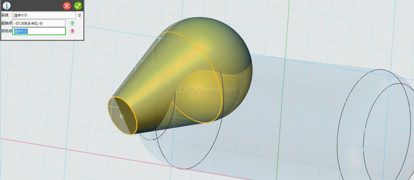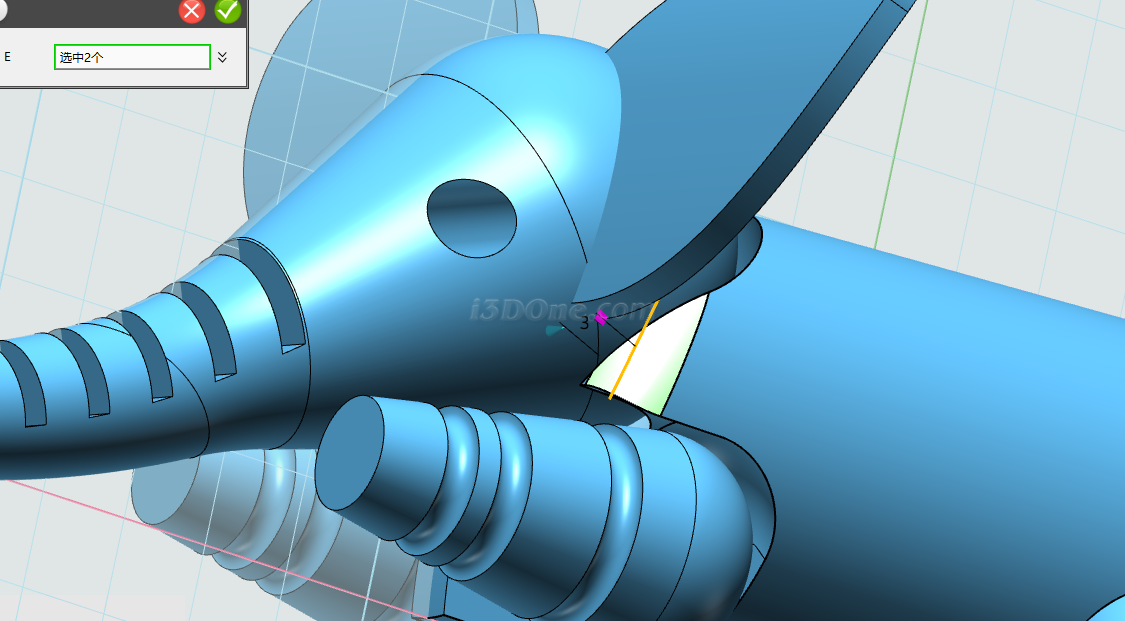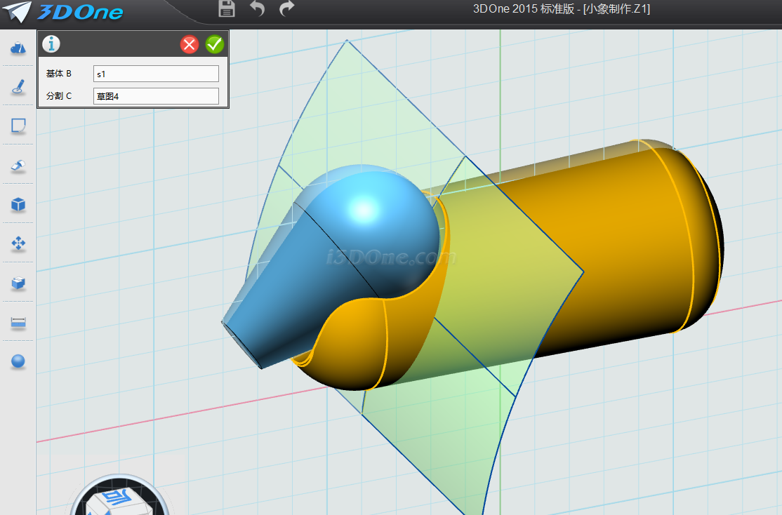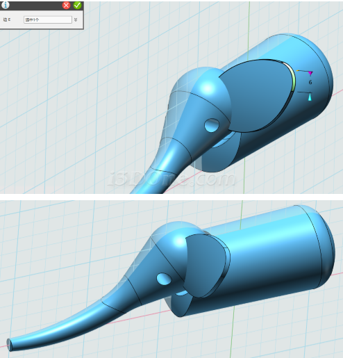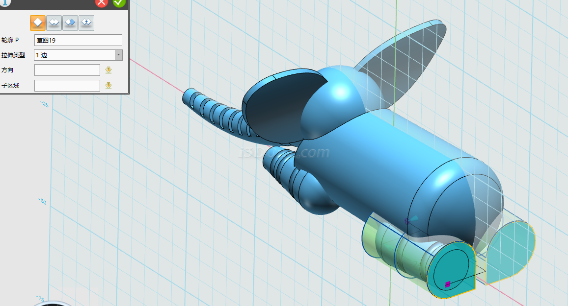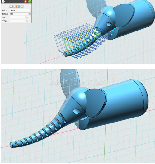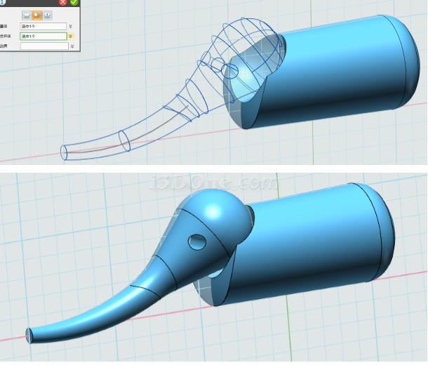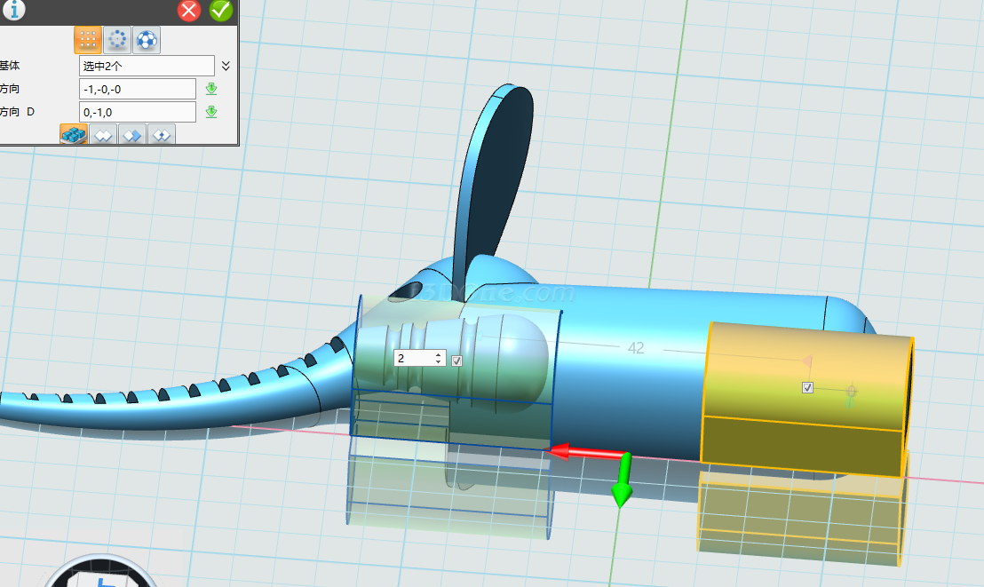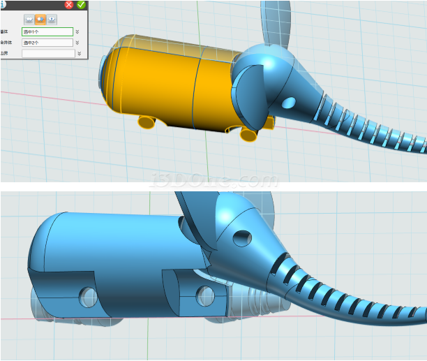 基體選擇大象身體,合并體選擇拉伸的兩個圓柱,布爾運算設為減運算,如圖完成合并: