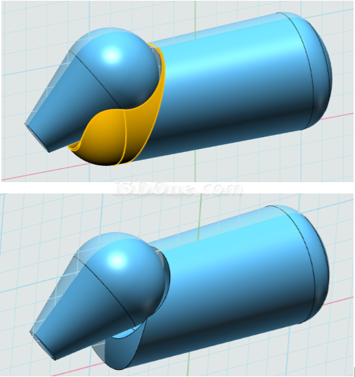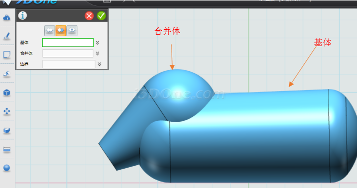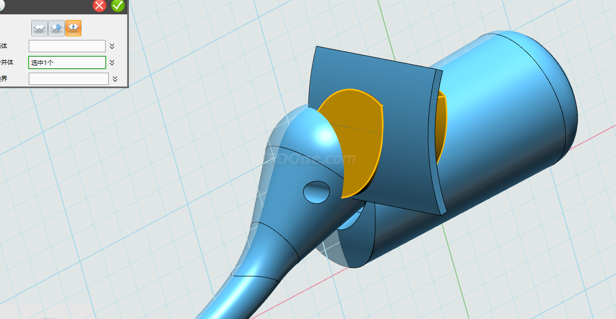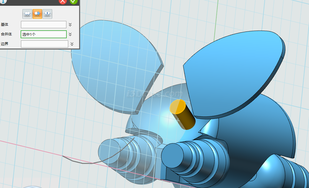 選擇組合編輯命令,頭部設為基體,上步驟拉伸的圓柱實體設為合并體,布爾運算設為減運算