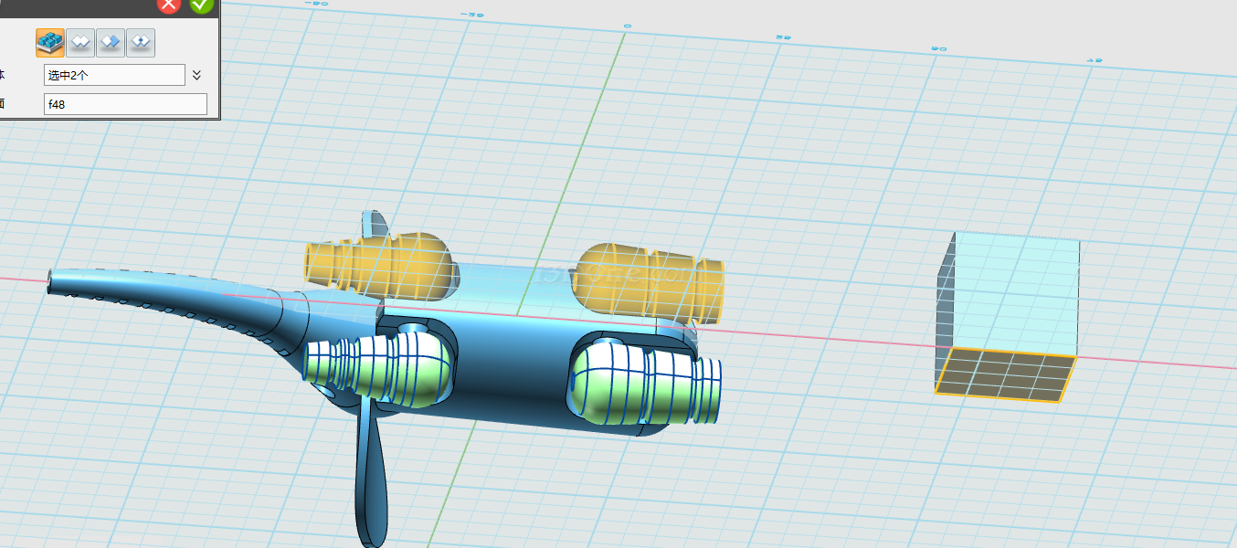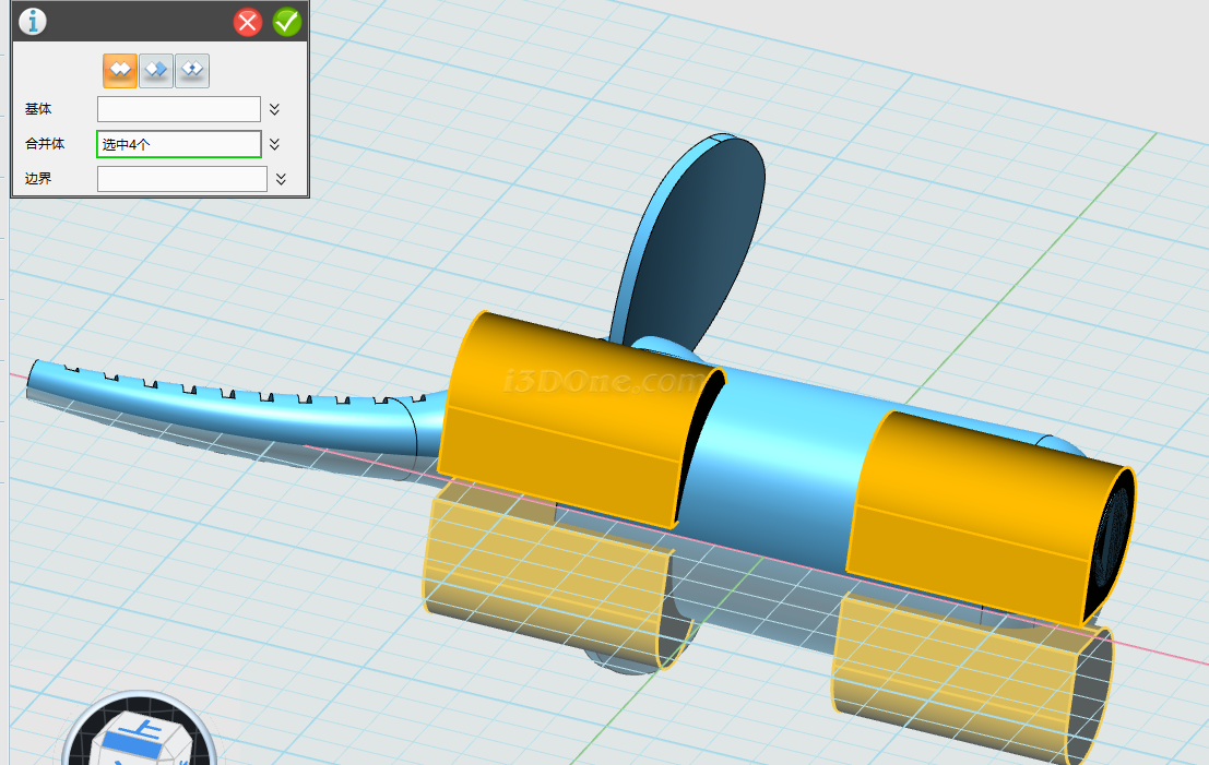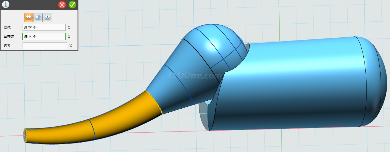 完成隱藏,選擇組合編輯命令,如圖,基體選擇身體部分,合并體選擇上步驟旋轉的實體: