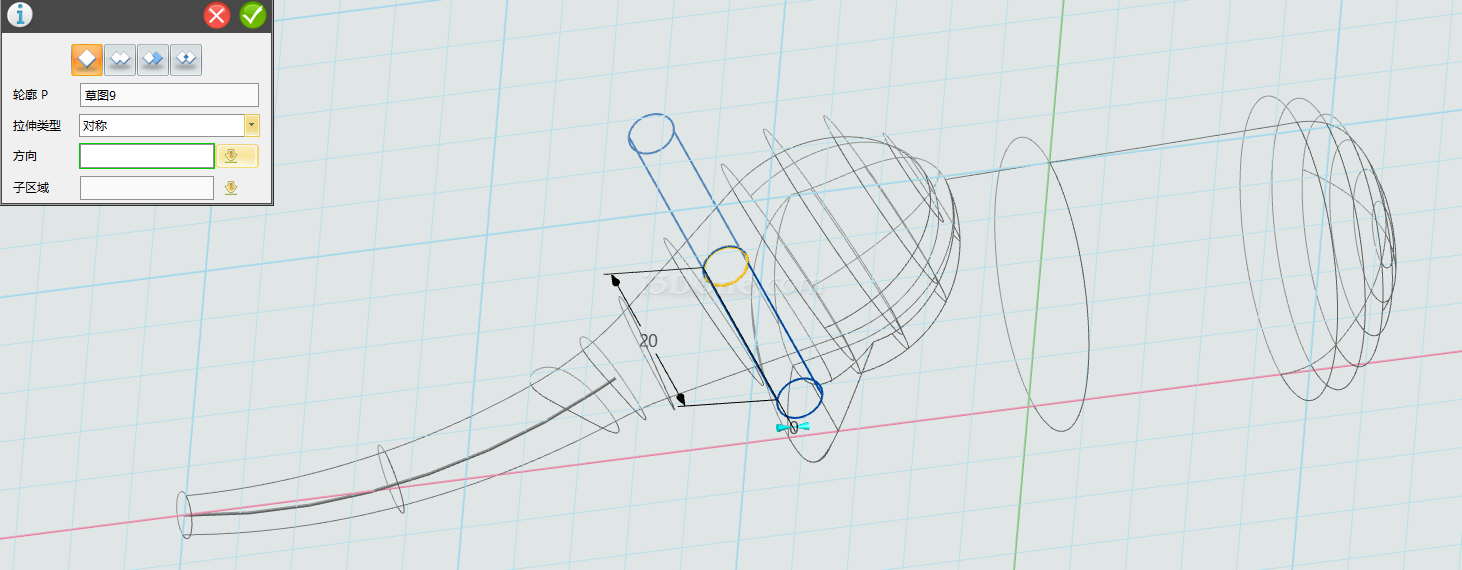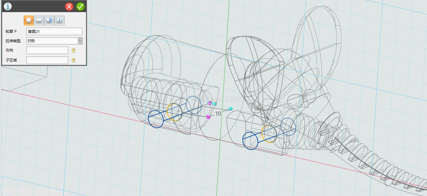 選擇拉伸命令,同樣調整顯示模式為線框模式,拉伸繪制的圓,對稱拉伸10,布爾運算設為加運算,如圖: