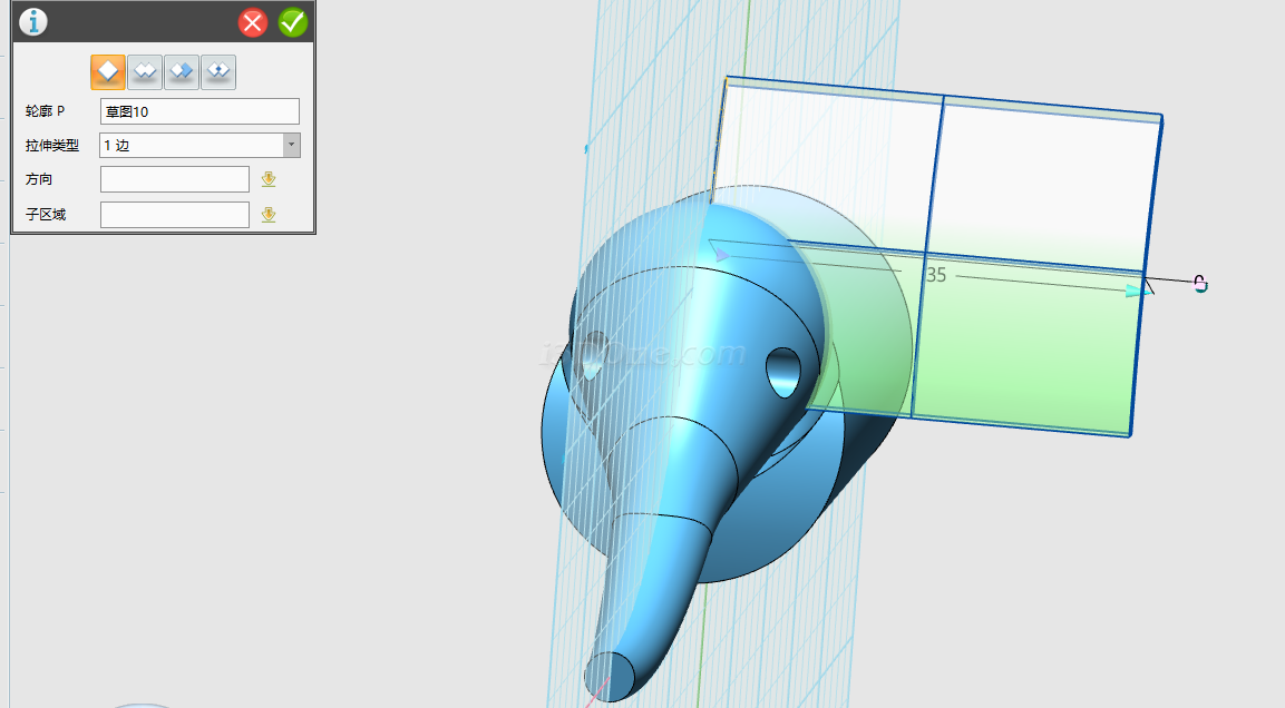 選擇拉伸命令,拉伸類型選擇對稱拉伸,布爾運算設為減運算,如圖所示: