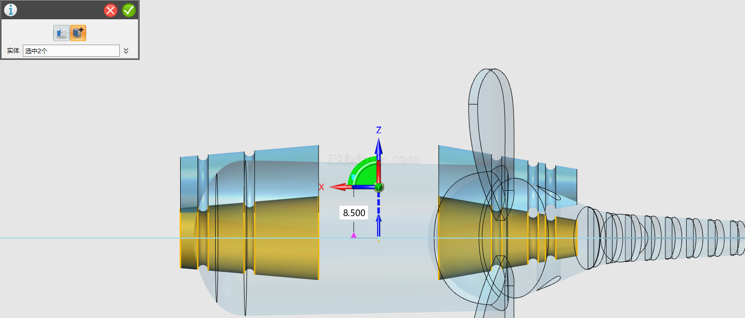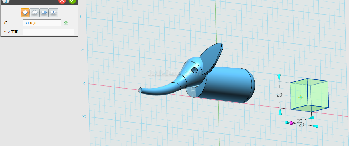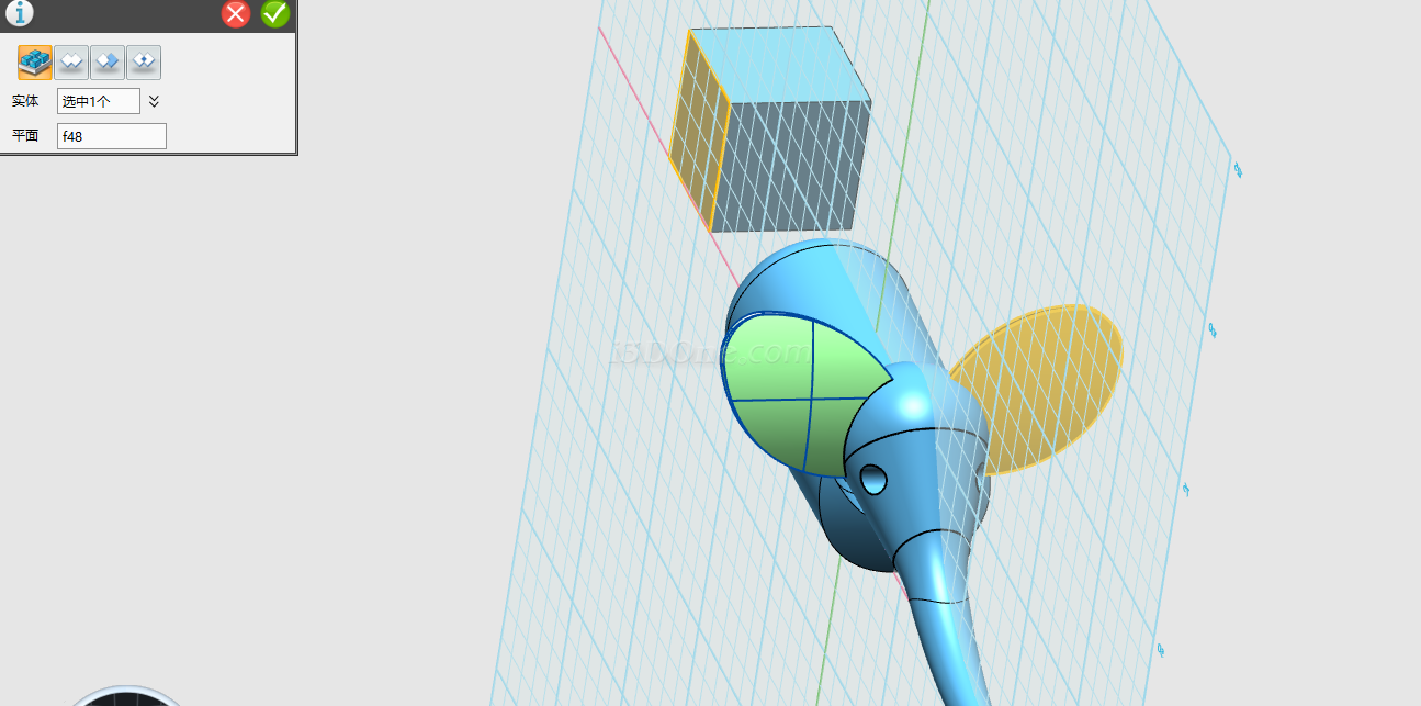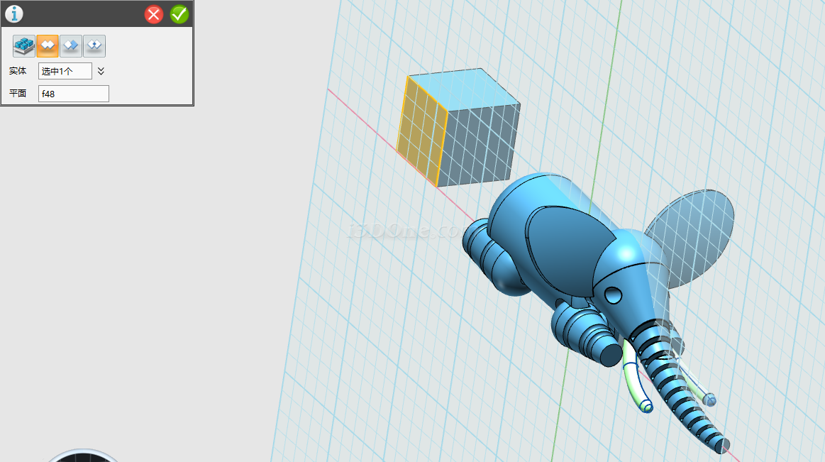 選擇鏡像命令,實體選擇象牙,鏡像面選擇如圖所示,布爾運算設為加運算: