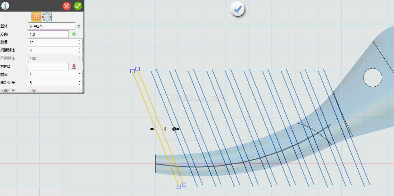 選擇陣列命令,陣列實體選擇上步驟拉伸的實體:如圖,陣列距離為42,數量2個,方向選擇紅色箭頭方向如圖: