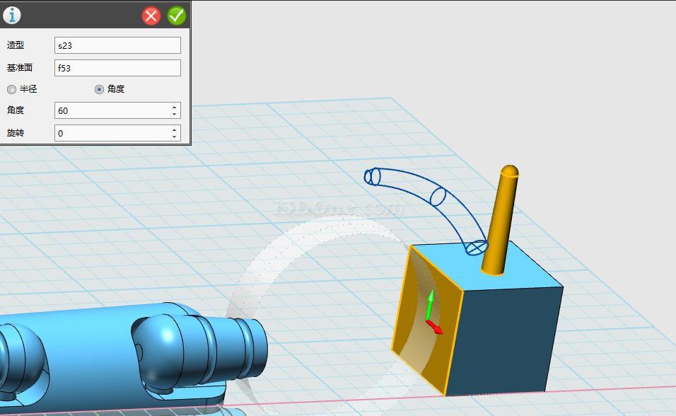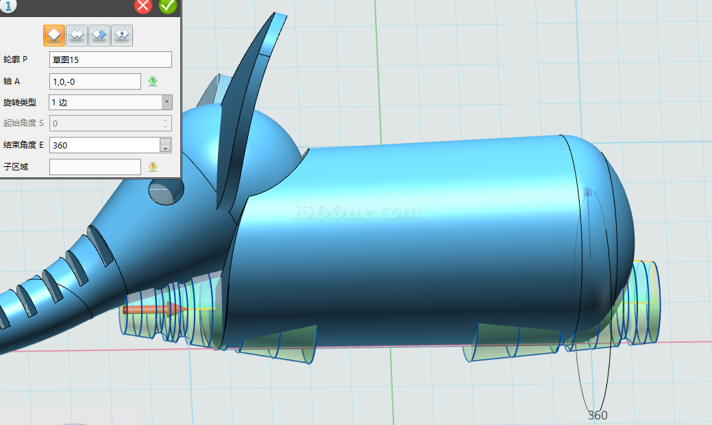 選擇旋轉命令,布爾運算設為第一項,基體。完成旋轉。
