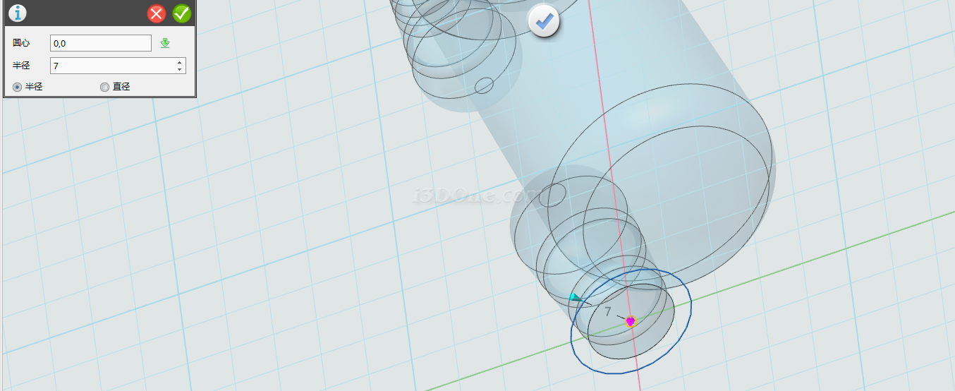 選擇圓命令,在網格平面上繪制圓,位置如圖: