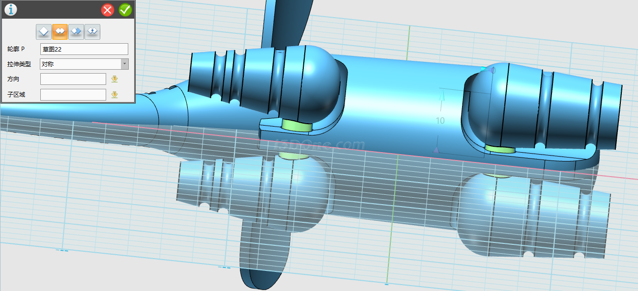 輪廓選擇繪制的草圖,對稱拉伸10,如圖: