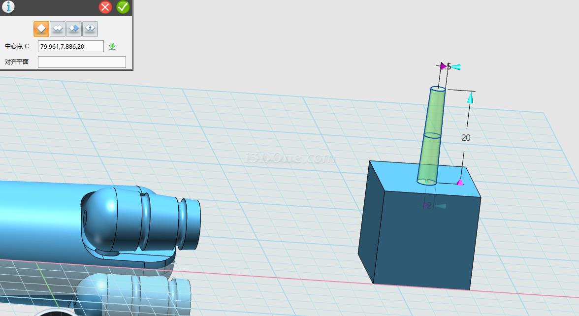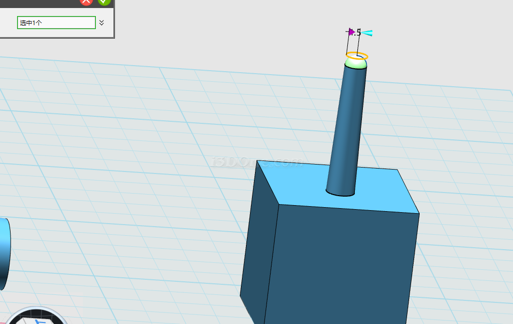 如圖,選擇圓錐體命令,在六面體上方繪制一個圓臺,頂部半徑為1.5,高位20,底部半徑為2,完成圓臺建立。