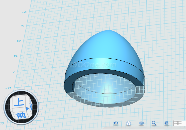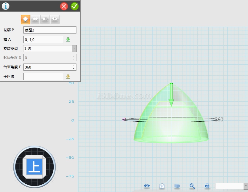 4、盔沿。圓柱體1,中心(0,-25,0),R=50,H=15; 圓柱體2,中心(0,-40,0),R=40,H=20;沿Y軸方向移動圓柱體2,距離15;