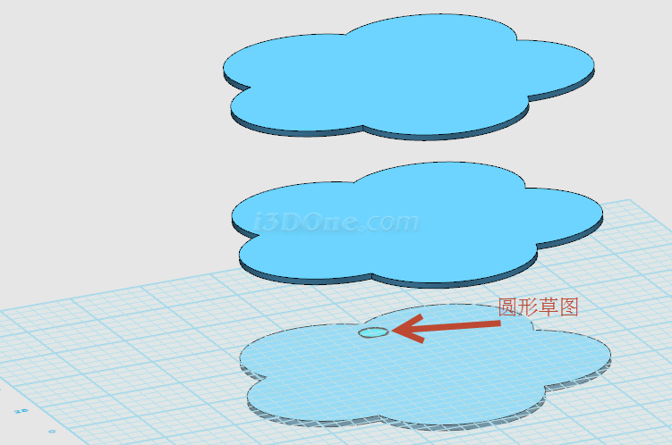 11、與第1步相同的設置后,在草圖繪制中選擇“圓形”命令,以基準平面為平面,在(0,-52)為圓心,半徑9mm,作一個圓形,退出草圖,然后將其向上拉伸,穿過上面兩個面板,結果如圖所示: