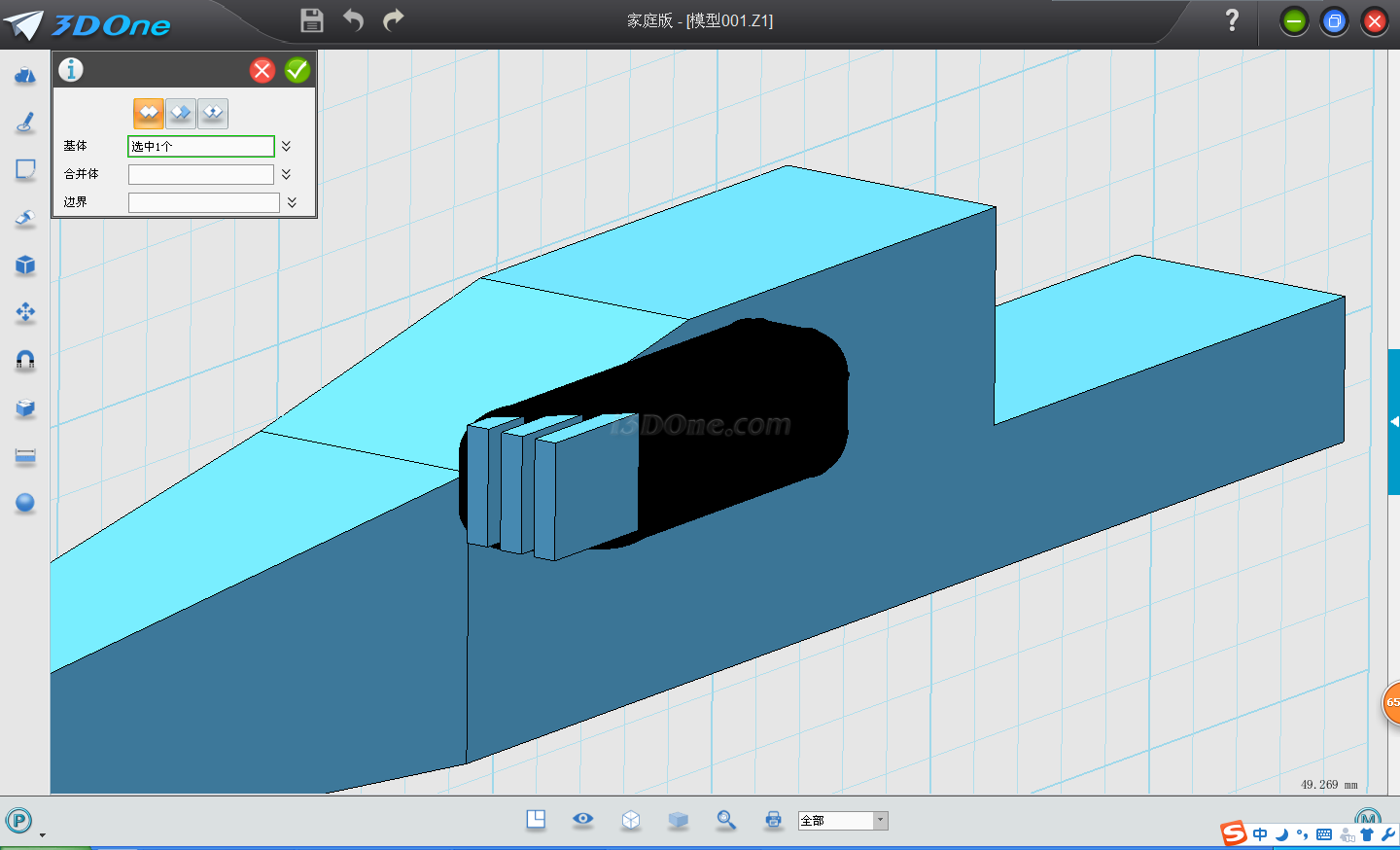 11. 使用組合編輯→減運算,基體選擇實體分割后的實體,合并體選擇陣列的三個長方形。