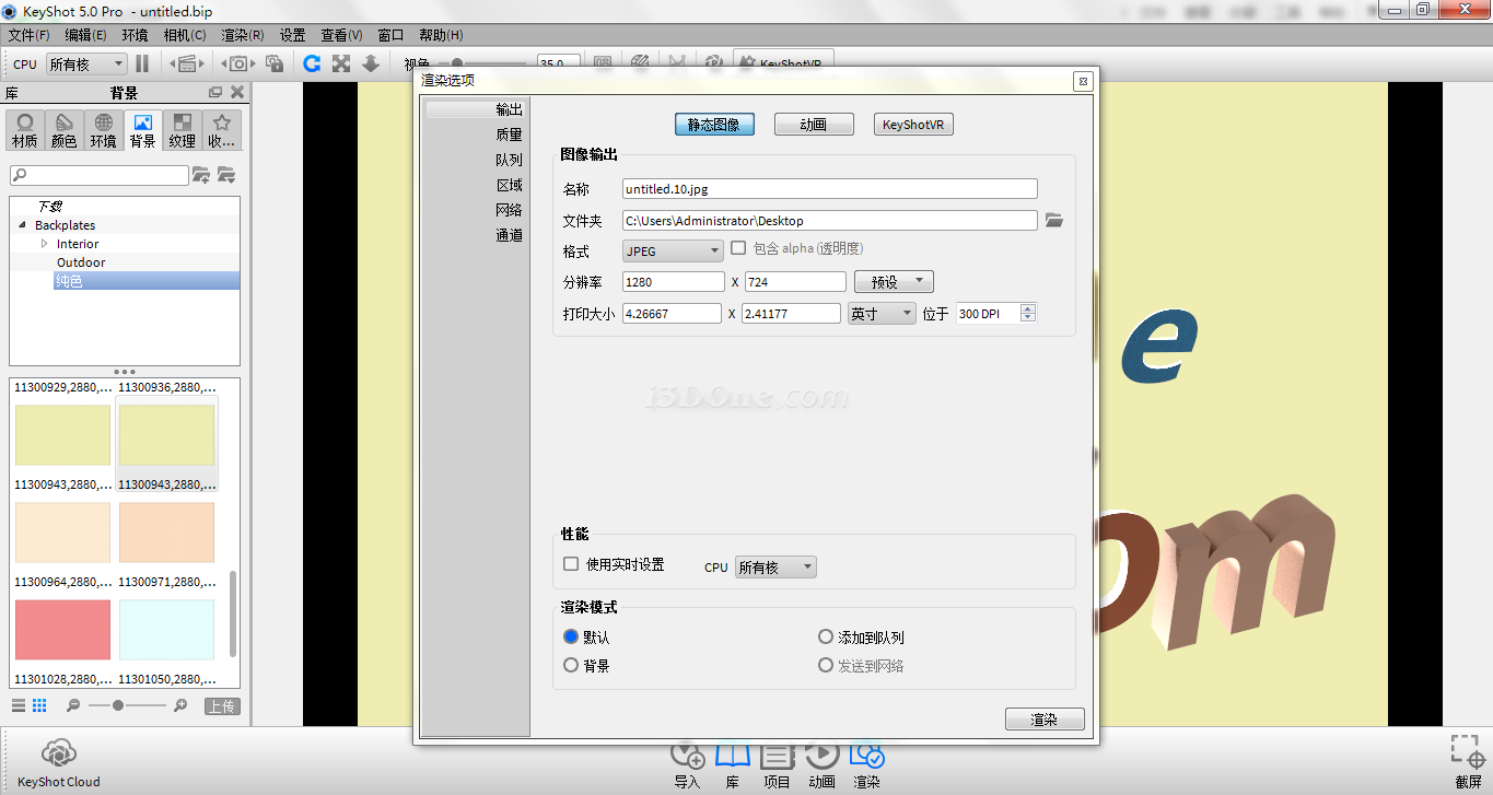 6. 材質渲染后,點擊底部渲染按鈕彈出的對話庫,輸入名稱、文件夾(即保存路徑)、分辨率(一般改為1280*720)。