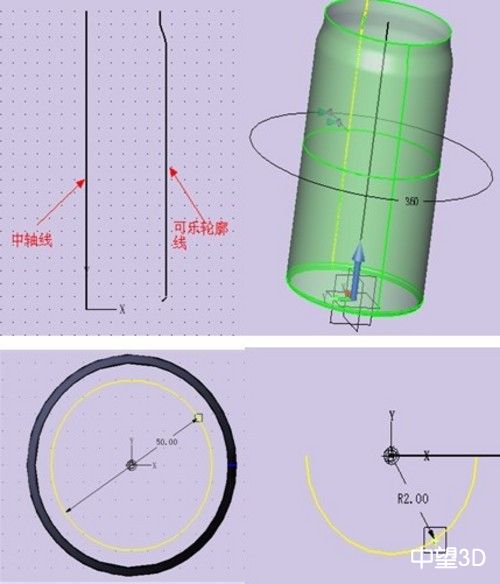 首先我們創建一個草圖,定好中軸線(總高115)和可樂罐的基本輪廓線。然后使用旋轉命令讓輪廓線繞軸線360度旋轉創建出基本輪廓,接著在中軸線底部為中心的平面上畫一個大圓(R25),在大圓的邊上再畫個R2.0的小圓。