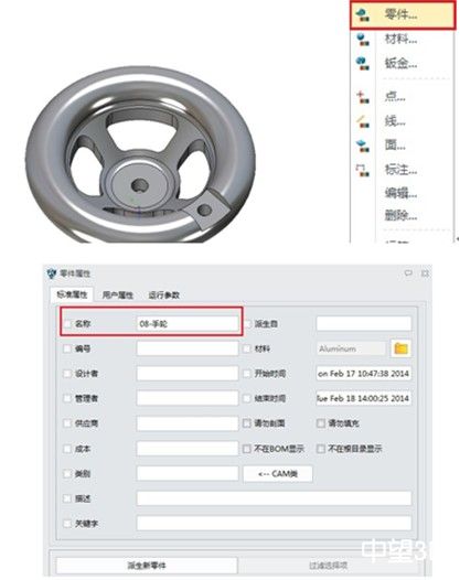 第六步:打開手輪圖檔,點擊屬性-零件屬性,可以看到,零件名稱同步修改,如下圖所示