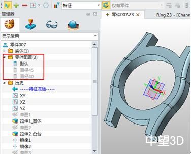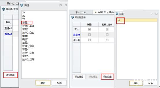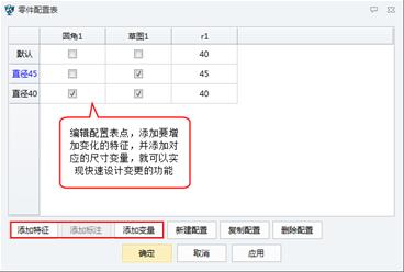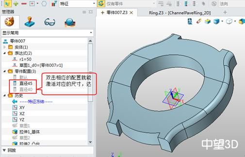 2、中望3D編輯配置表及添加特征尺寸變量,如我們現在通過更改表框的最大外徑來改變產品的設計來添加特征及尺寸。下面我們以最大外徑為45和40為例來說明: