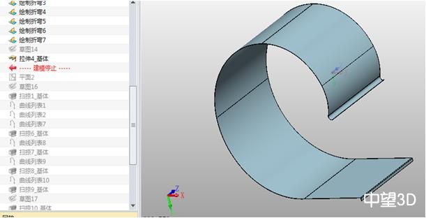 3、中望3D支持沿線折彎。如下圖零件就是使用“沿線折疊”命令完成的特征,操作過程簡潔快速。