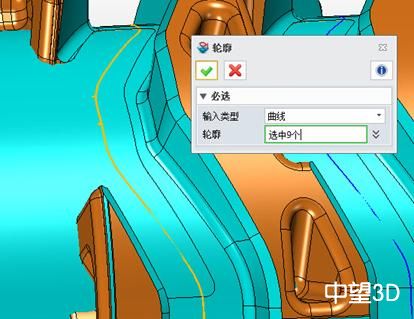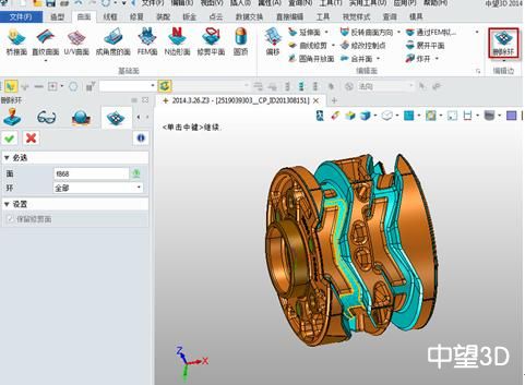 首先,創建一個面,用來生成刀軌。使用中望3D“曲面”里面的“刪除環”功能,選中底部的藍色面。整個操作方式十分直觀。