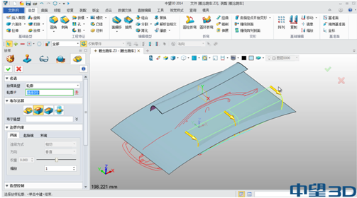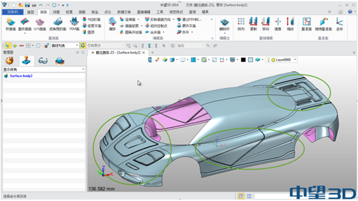 1. 使用放樣,U/V面,F(xiàn)EM面創(chuàng)建高質(zhì)量的曲面。中望3D有很多曲面創(chuàng)建的命令,特別好用的是U/V面命令創(chuàng)建網(wǎng)格曲面,并且非常方便快捷的達到G1/G2的曲面,同時FEM是創(chuàng)建多邊面的利器。這些曲面命令都是創(chuàng)建車身曲面的高效最大保證,加快了設(shè)計師的操作進程。如下圖: