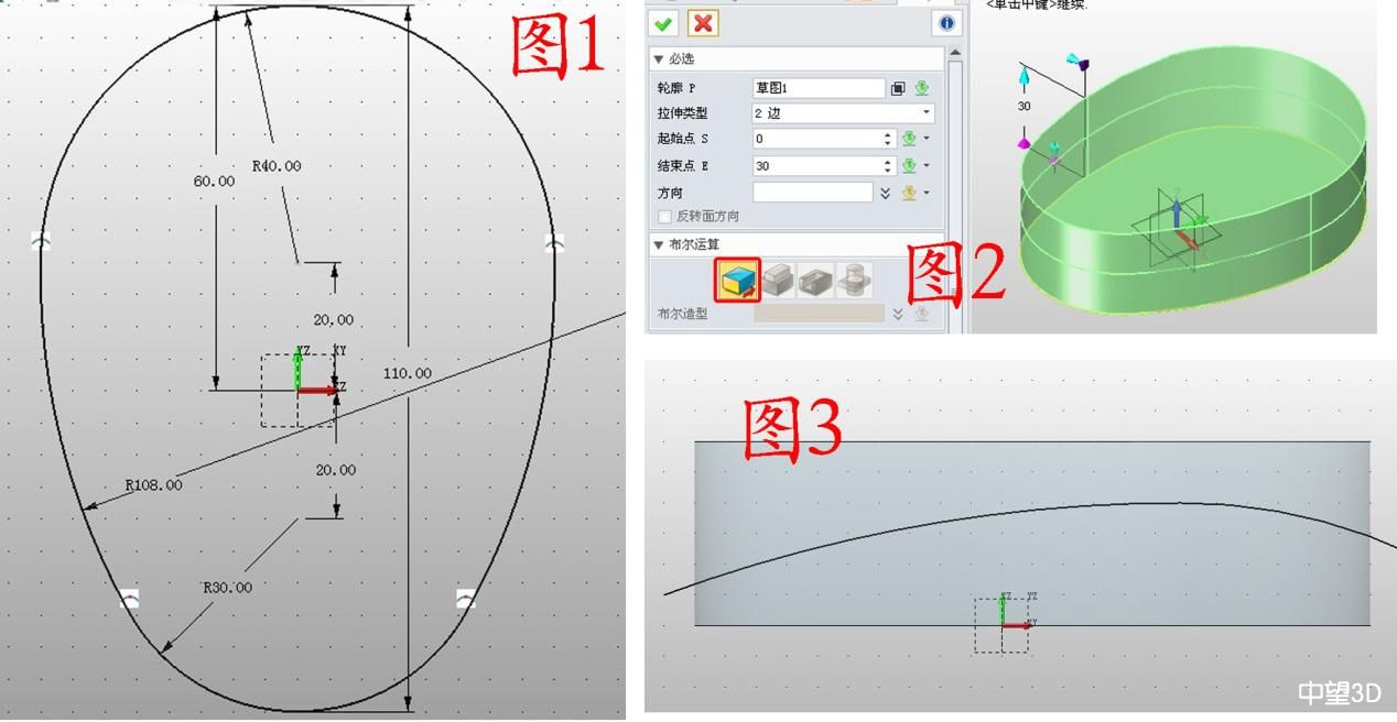 1. 在XY面快速插入草圖1,繪制圖1所示的圖形,數據如圖(4段弧線相切連接),繪制完成后點擊“連接”,將其連成一個整體;點擊造型——拉伸,拉伸草圖1,數據如圖;在YZ面插入草圖 2,繪制圖3所示曲線,大致相似即可。