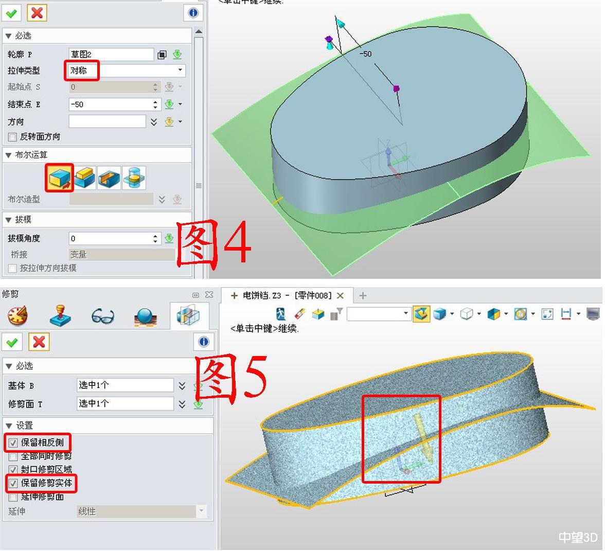 2. 點擊拉伸——基體,拉伸草圖2,形成曲面,命名為曲面1,如圖4;點擊造型——修剪,“基體”為實體造型,“修剪面”為曲面1,如圖5,注意紅框中黃色箭頭的方向為要保留的方向。另外,在保留修剪體的前面打鉤,保留曲面1。
