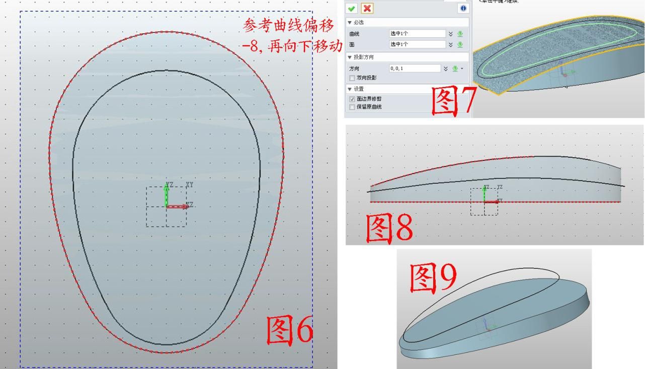 3. 在XY面插如草圖3,繪制圖6所示的閉合曲線(繪制技巧:將紅色虛線所示的部分設置成參考曲線,點擊偏移,將紅色虛線偏移-8,偏移后即可得到黑色的實線,由于版本不同,有些偏移后可能還是紅色虛線,此時在虛線上右擊,點擊即可轉化成可編輯的實線,然后再將其向下移動一點距離);點擊線框——投影到面,曲線選擇草圖3,面選擇曲面1,如圖7,投影后的曲線命名為曲線1,隱藏曲面1;在YZ面插入草圖,繪制圖8所示的曲線,然后按照步驟2的方法,先拉伸在修剪,效果如圖9。