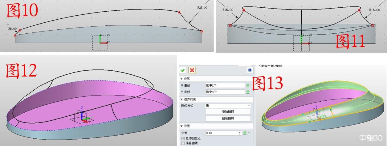 4. 在YZ面插入草圖,點擊參考曲線——相交曲線,按照圖10設置出參考點,分別在兩個參考點間繪制半徑為8和25的弧線,分別命名為曲線2、曲線4;同理,在XZ面插入草圖,繪制兩個半徑均為15的圓弧,分別命名為曲線3、曲線5,如圖11;將實體造型的上表面刪除,將開放邊命名為邊1,如圖12;點擊曲面——U/V曲面,“U曲線”為曲線1、邊1,“V曲線”為曲線2、3、4、5,如圖13。