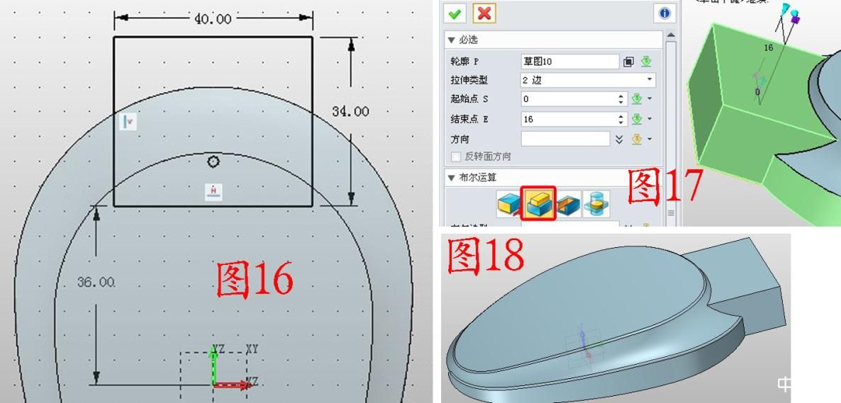 6. 在XY面插如入草圖4,繪制圖16所示的矩形,參數如圖;點擊拉伸——加運算,拉伸草圖4,數據如圖17;將上蓋邊緣做圓角處理,如圖18所示;