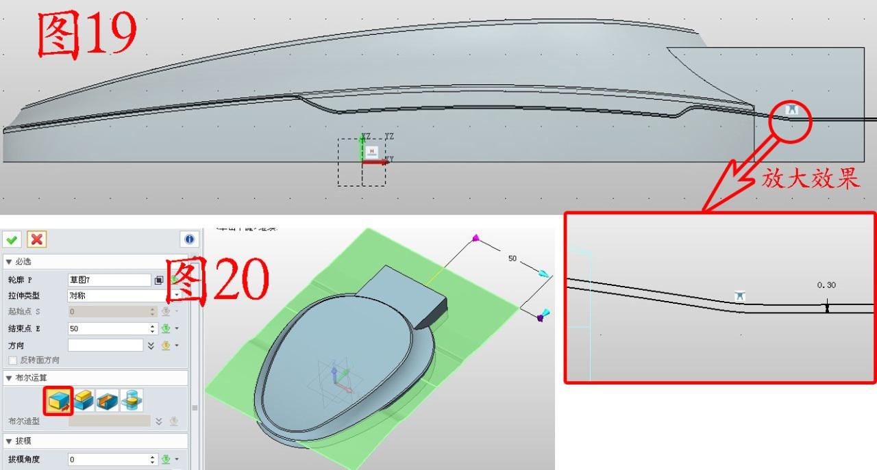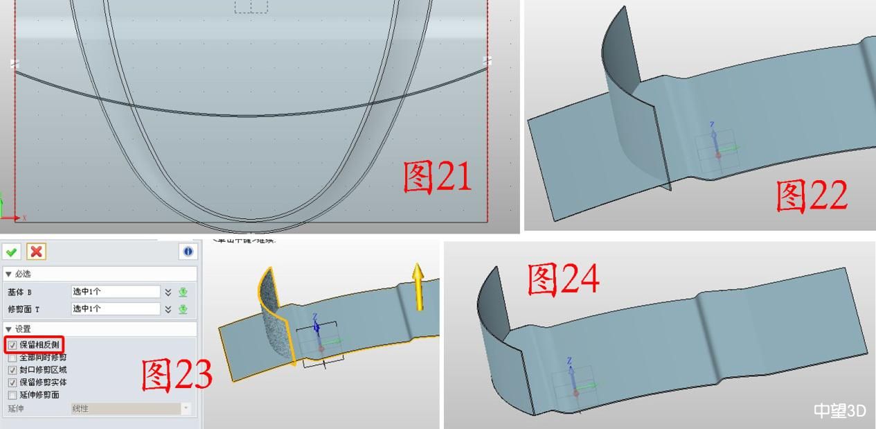 8. 在XY面插入草圖5,同理繪制圖21所示的閉合圖形,退出草圖后拉伸草圖5,隱藏電餅鐺造型,如圖22;點擊造型——修剪,“基體”為豎直實體,“修剪面”為水平實體的上表面,注意保留方向,如圖23;同理,修剪成圖24所示的造型。