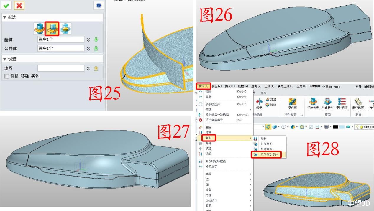 9. 顯示出電餅鐺造型,點擊造型——組合——減運算,“基體”為電餅鐺造型,“合并體”為豎直實體,如圖25;同理再次組合水平實體,效果如圖26;將造型邊緣做圓角處理,如圖27。