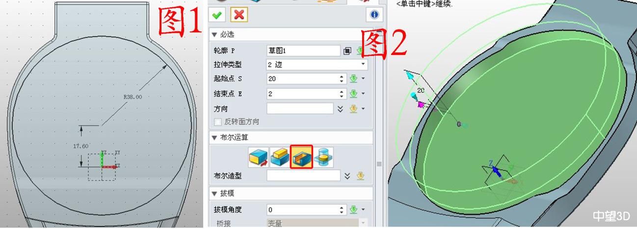1. 在左側“底座”組件上右擊,點擊“編輯”,快速進入編輯狀態。在XY面插圖草圖1,繪制圖1所示的圓,參數如圖;用拉伸的減運算拉伸草圖1,參數如圖2。