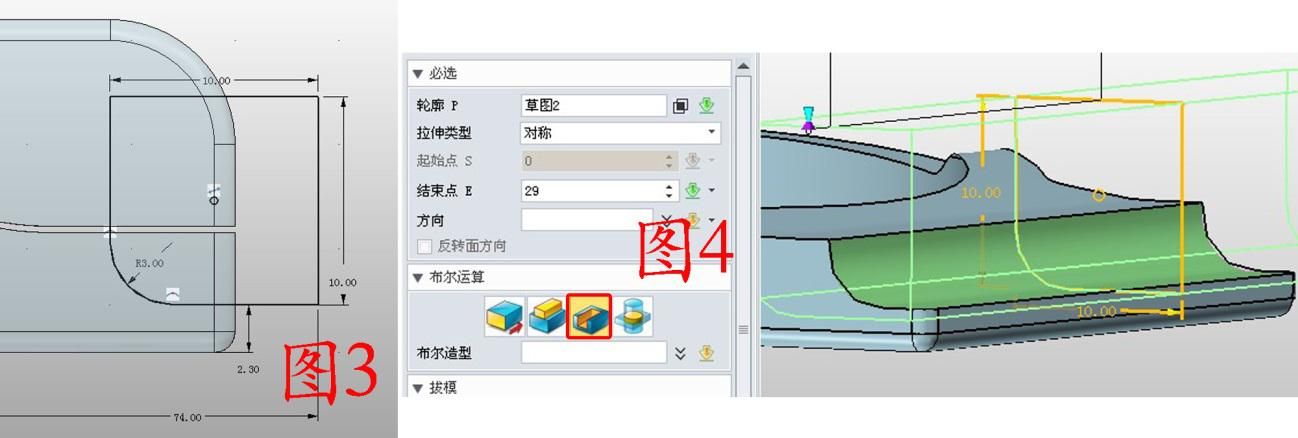 2. 在YZ面插入草圖2,繪制圖3所示的圖形,注意繪制完成后將有圓角部分的線連接成整體,這樣拉伸出來比較美觀;用拉伸的減運算拉伸草圖2,如圖4。