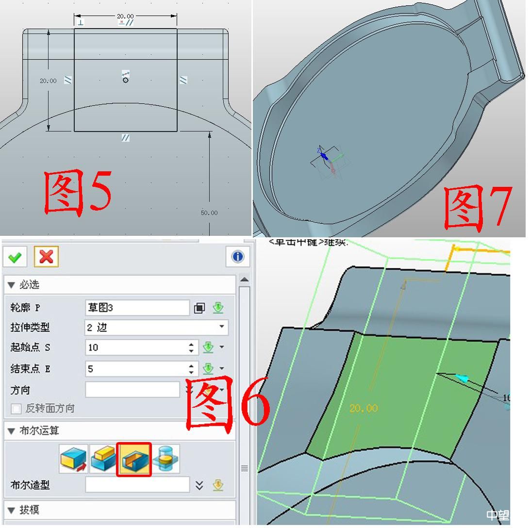 3. 在XY面插入草圖3,繪制圖5所示的矩形;還是用減運算拉伸草圖3,如圖6;將邊緣部分做圓角,如圖7。