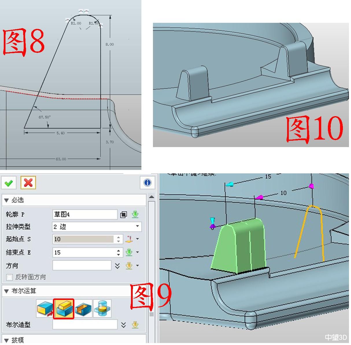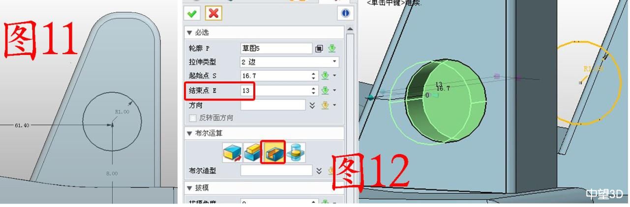 5. 在YZ面插入草圖5,繪制圖11所示的圓,參數如圖;用減運算拉伸草圖5,注意,“起始點”可以用捕捉的方式獲取(在作圖區右擊“目標點”,將鼠標放在起始部位點擊即可),還是保留輪廓,做另一側的拉伸,如圖12,此時“結束點”是13,要記住13這個數據,因為后面還要用到,當然是其他適當的數字也可以,不過后面要和后面涉及到的一個參數一致。