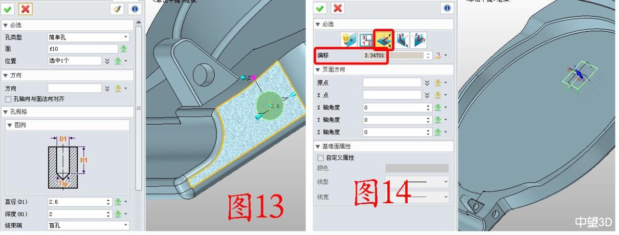 6. 點擊造型——孔,在圖13所示的位置打孔,參數如圖13;插入XY基準面,“偏移”數據用捕捉的方式獲取,此時右擊作圖區,選擇“曲率中心”將鼠標放在孔的邊緣,點擊即可獲得參數,如圖14。
