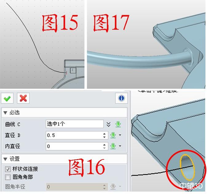 7. 在基準面上插入草圖6,繪制圖15所示的樣條曲線;點擊造型——桿狀掃掠,曲線選擇孔的邊緣(圖16紅圈所示),直徑為0.5;同理,將草圖6也用桿狀掃掠處理,效果如圖17。