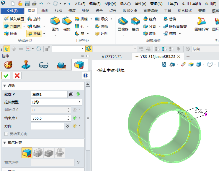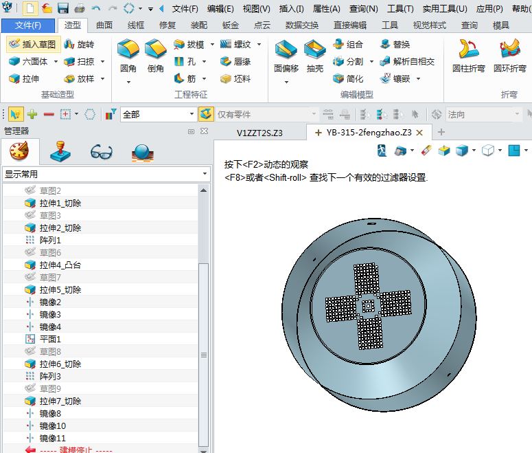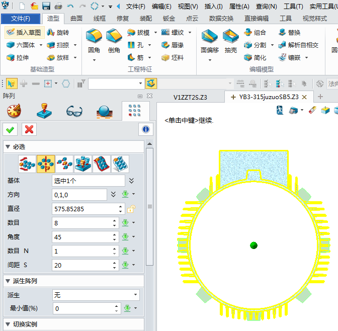 4、繪制凸臺,點擊草圖鍵,繪制凸臺輪廓,拉伸完成1個凸臺,再使用中望3D的陣列命令,選擇圓形陣列完成其它凸臺的設計,這樣就避免了重復設計的麻煩,如圖:
