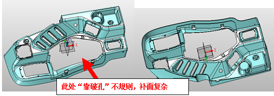 產品分析:1.產品分型面不規則;2.產品“靠破孔”多,且不規則,補面復雜.。