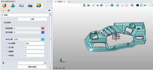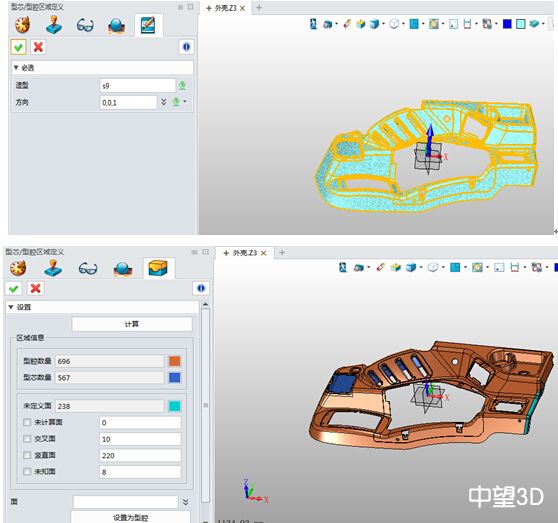 2.選擇“計算”,并選擇開模方向“Z”軸方向,系統自動計算上下模區域,計算結果如下: