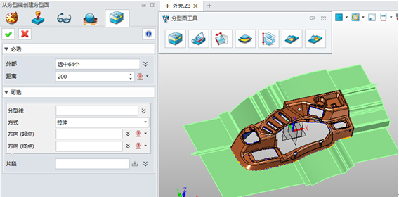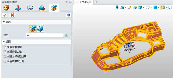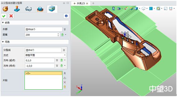 4.對產品進行“分離”,析出上下模型腔面,為模具分型面做準備:
