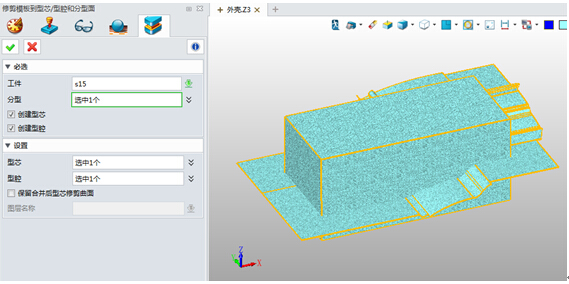 9.最后一步拆模,分開上下模仁,“工件”選擇上一步創建的“工件”,“分型”選擇創建的“分型面”,確認。