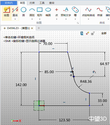第一步:插入草圖,可以把畫好中望CAD圖形直接復制到中望3D的草圖,如下圖,也可以直接在中望3D的草圖環境中直接繪制。