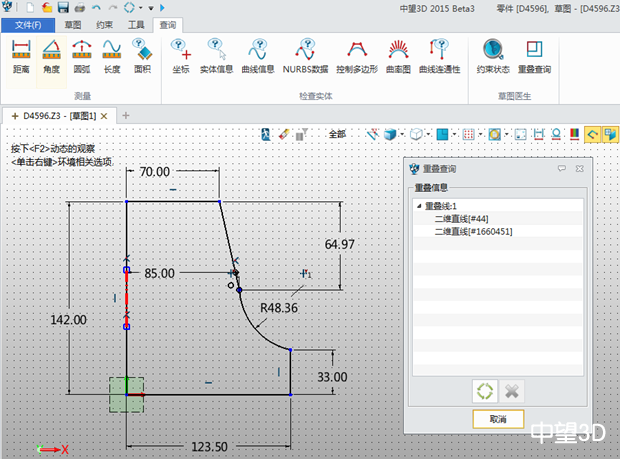 第三步:使用【重疊檢查】功能檢查線條。點擊【重疊檢查】,紅色顯示重疊部分,一般來說重疊對象是很難被發現,但軟件增加了清晰的列表及標注后,用戶就能靈活地決定是否刪除相關重疊部分,如圖3所示。