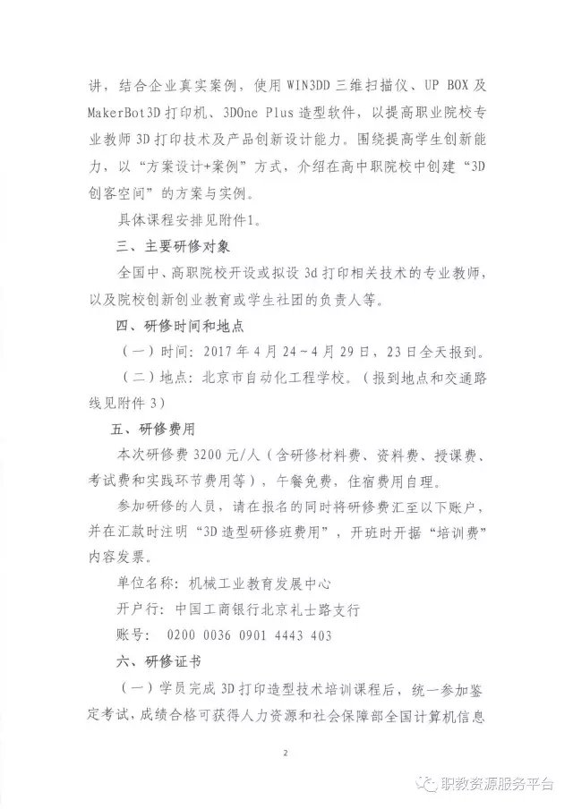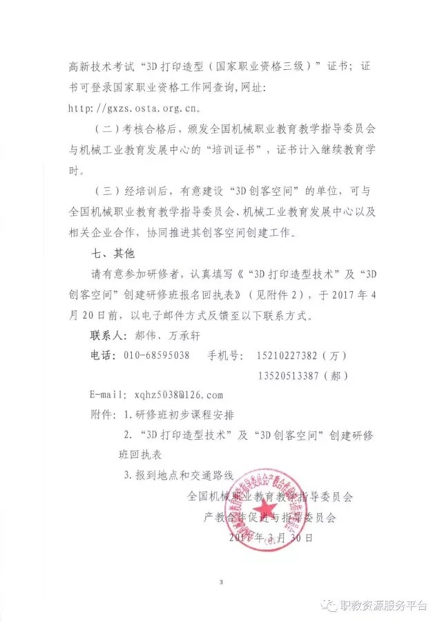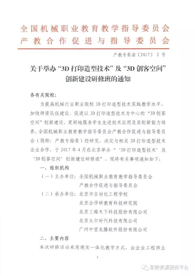 全國機械職業教育教學指導委員會產教合作促進與指導委員會關于舉辦“3D打印造型技術”及“3D創客空間”創新建設研修班的通知。