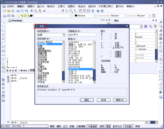 我們在CAD的使用中有些文字是需要跟隨圖紙的變化隨之變化的,比如是我們的存儲日期、打印日期、打印比例等等。中望CAD提供了字段的功能,這個功能定義了很多的動態的文字,我們使用時候就只要在我們的列表中選取即可。這樣使用時更加的方便快捷。