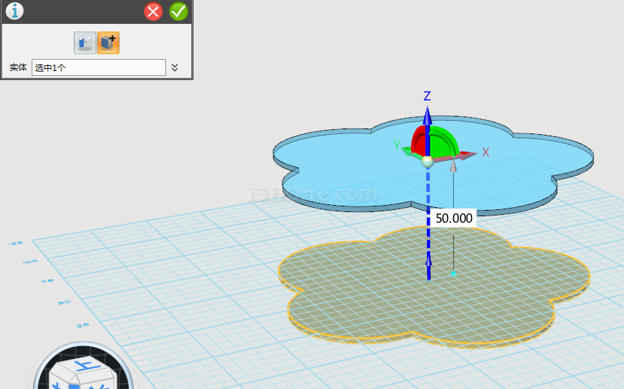 5、在鍵盤上按Ctrl+c,實體選擇剛拉伸出來的面板,起始點與目標點選取同一個位置,復制出相同的實體,然后選擇移動命令中的動態移動,如圖所示,向上移動50mm,確定后退出。